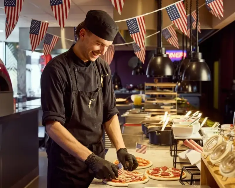 Expect familiar favorites, generous portions, and dishes that revolve around pure enjoyment. On Fridays and Saturdays, we serve American classics for dinner, prepared live by our chefs. Think juicy burgers, generously filled buns, and other comfort food favorites perfect for a relaxing night out. On Sundays, brunch is all about America's ultimate favorite: fluffy pancakes, complemented by savory classics.