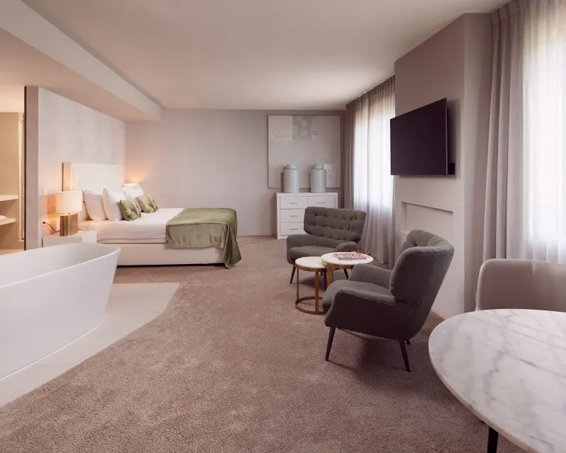 For optimal relaxation, we invite you to book an overnight stay in one of our luxurious suites on the 6th floor. Relax and unwind in the beautiful, open bathroom, where you can use the Finnish combination sauna with infrared and bathtub!
